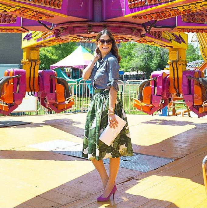 3. 데님 탑 + 패턴이 들어간 스커트 + 힐