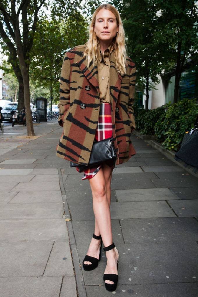 런던 패션 위크의 블로거 레베카 로리(Rebecca Laurey). 겐조 스웨터와 셀프 포트레이트 재킷에 날 바렛의 스커트, 지미 추의 백, 이사벨 마랑의 부츠와 스텔라 맥카트니의 선글라스를 매치했다.