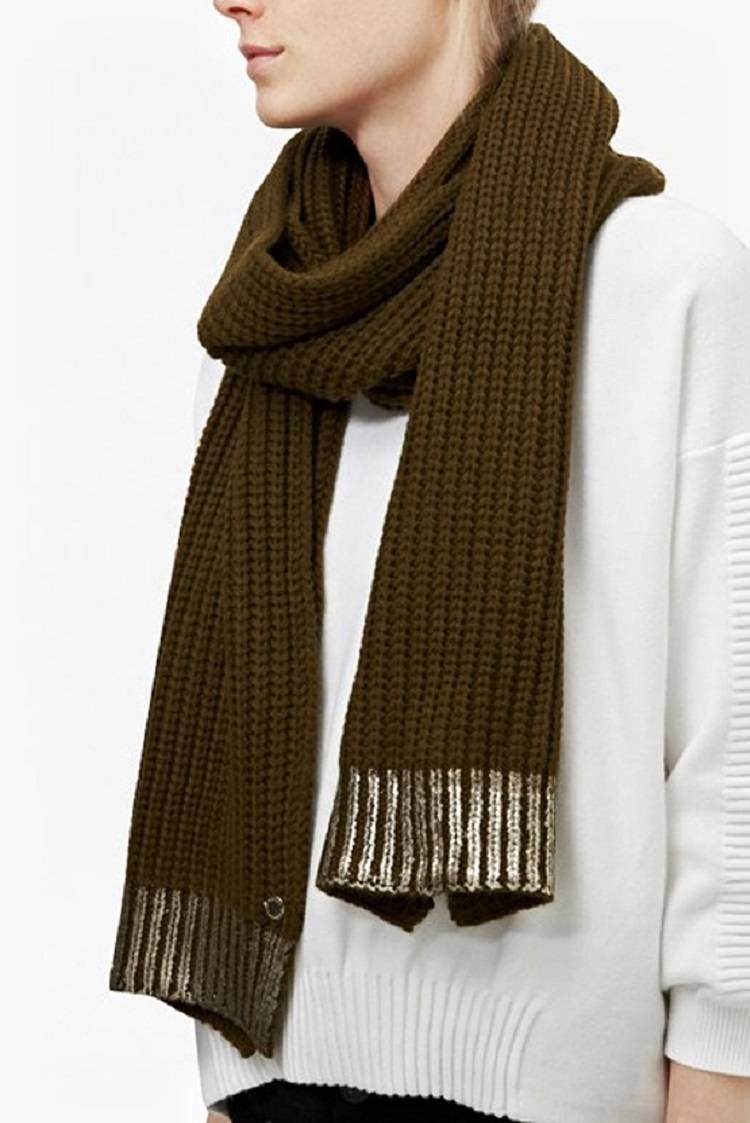 The double wrap: 이 방법은 스카프 길이가 최소한 1.5미티가 필요하다. 한번만 감싸지 말도 두 번 감싸는 것이 포인트로 마음까지 따뜻하게 해준다. 제품은 French Connection의 은박 프린트의 에린 스카프로 가격은 약 78천원.