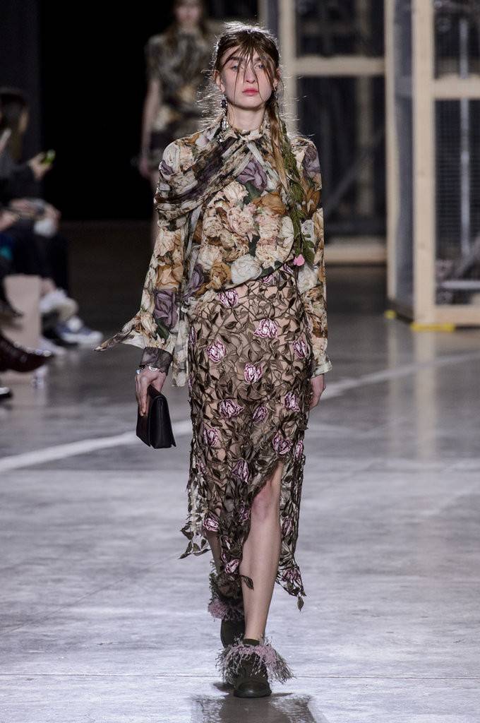 클래식한 퍼 코트, 테디 재킷, 니트로 만든 플라워 카디건 등이 돋보였으며 체인이 흔들리는 안경, 반짝이는 브로치, 모직 스카프, 깃텃 트림 등은 유니크한 요소를 부각시켰다. 또한 야생적인 느낌의 오렌지 팝은 스트라이프 폴로 넥과 스커트 콤보, 이국적인 자수, 흑백 리본을 이끌며 컬렉션에 활기를 불어 넣었다.