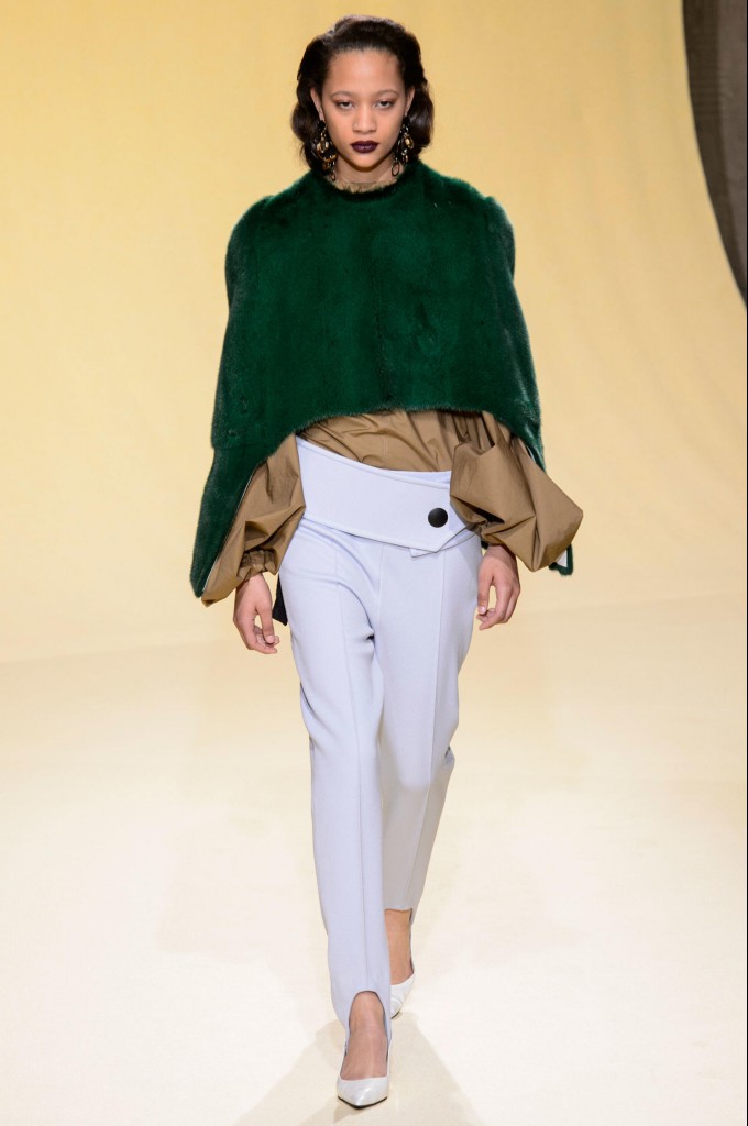 마르니는 예술 작품처럼 느껴지는 그래픽 프린트, 실험적이지만 여성적인 실루엣, 대담한 컬러 사용으로 광신적인 추종자를 구축하고 있는 대표적인 브랜드 중 하나다.  2016 가을/겨울 마르니 컬렉션은 과장된 비율, 능수능란하게 믹스한 프린트, 정교한 레이어링과 글래머러스한 장식 등 마르니가 추구하는 디자인 시그너처인 예술성을 완벽하게 보여주었다. 한마디로 엘레강스 맥시멀리즘의 마스터 클래스였다.