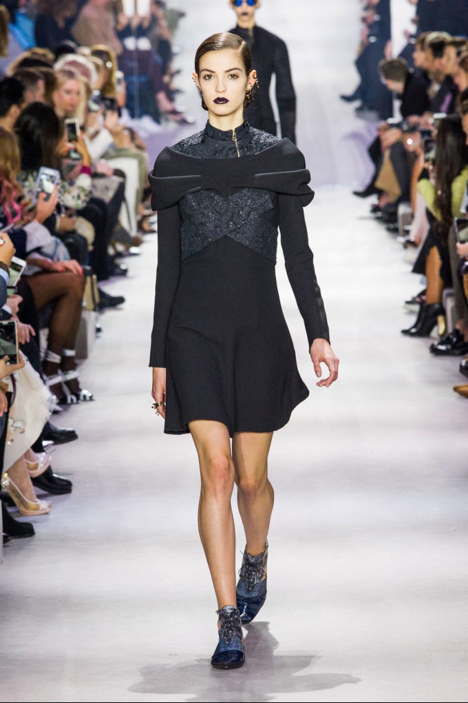 디올 2016 F/W 컬렉션은 라프 시몬스가 떠나고 후임이 정해지지 않은 상태에서 디자인팀에서 진행되었다. 루브르 박물관에 세워진 미래적인 우주선 모양의 컬렉션장을 찾은 프레스 및 바이어들은 디올의 첫 룩킹을 보고 우려는 기대감으로 바뀌었다. 패션쇼는 결코 단순하지 않은 클래식한 실루엣의 다크 네이비와 블랙 룩 시리즈로 시작되었으며 빅 러플과 추상적인 플로랄 프린트, 컬러풀한 자수, 볼드한 장신구가 뒤를 이었다.