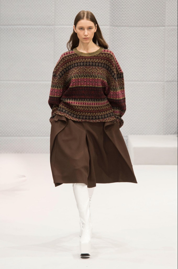 런웨이 초반에 제시된  몇가지 스타일룩들은 명백한 꾸띄르 방법론의 혼합이었다. 그레이와 라이트 브라운의 울 재킷과 코트, 니-렝스 스커트, 팬츠와 함께 입은 A라인 웨이스트의 패딩 등 요즘 여성들이 즐겨 입는 스포티한 피스들과 함께 바스크와 코쿤 형태의 발렌시아가 유산도 다수 선보였다.