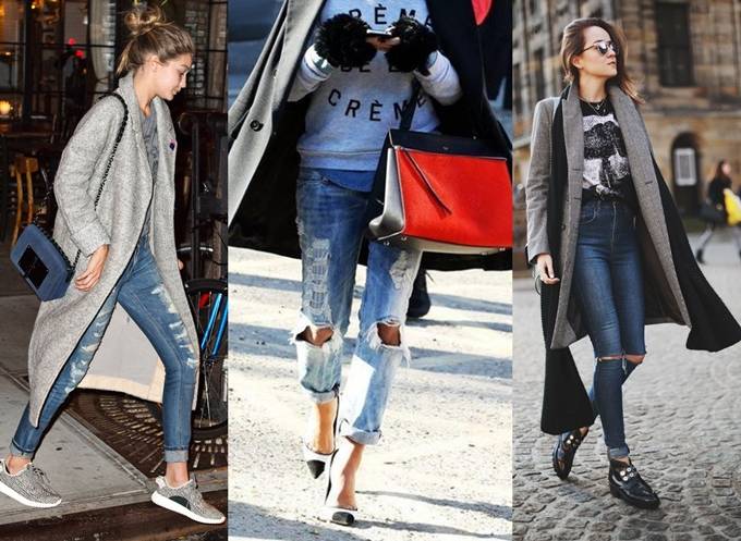 매력적인 복고 풍 트렌드인 디스트로이드 진을 겨울철에 좀 더 멋스럽게 매치할 수 있는 방법은 무엇일까? 먼저 다양한 컬러와 무난하게 조화를 이루는 데님이지만, 올 겨울에는 버전을 바꾸어 모노톤과의 찰떡 조합을 시도해 보자. 따뜻해 보이면서도 찢어진 데님의 포인트를 잘 살려줄 수 있는 환상적인 궁합을 연출할 수 있다.