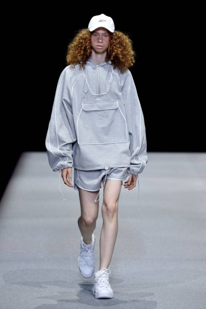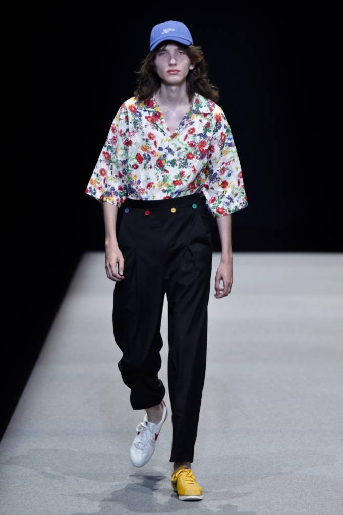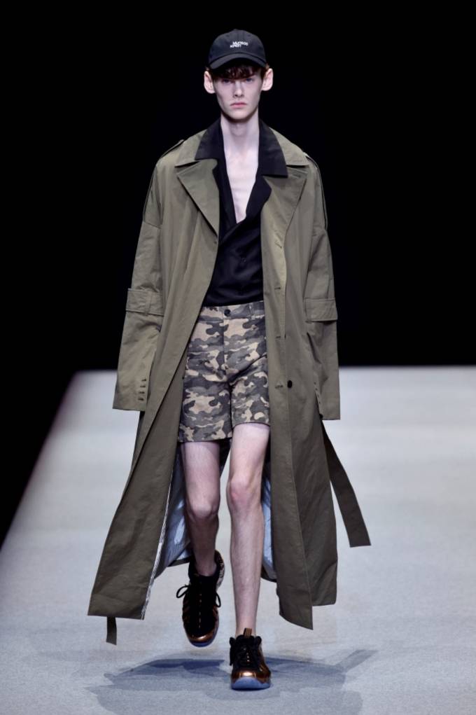 그는 핀스트라이프 슈트 위에 카무플라주 프린트의 베스로브 코트를 레이어드해 의무적으로 군복무를 하는 북한의 젊은이들에게 윙크를 보내는 듯 했다. 또한 무릎 길이의 카무플라주 쇼츠와 주름진 면화로 된 길게 소용돌이치는 올리브 트렌치와 비슷한 컬러의 오버사이즈 실크 보머 재킷 역시 같은 연장선이었다.