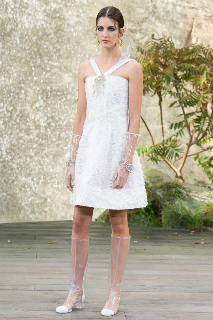 파리 패션위크 마지막 날인 지난 10월 3일(현지 시간)에 열린 2018 봄/여름 사넬 컬렉션은 프릴과 후드가 달린 케이프, 캡-토 PVC 부츠 등 플라스틱으로 가득했다. 칼 라거펠트는 투명한 플라스틱 컬렉션을 원시적인 자연과 나란히 배치했다. 유연하고 하이-테크적인 섹시한 플라스틱은 미니 케이프, 트렌치 코트, 니 하이 부츠, 긴 장갑, 파크 레인저 햇, 길쭉한 팔찌와 레인코트, 많은 백 등으로 선보였다.