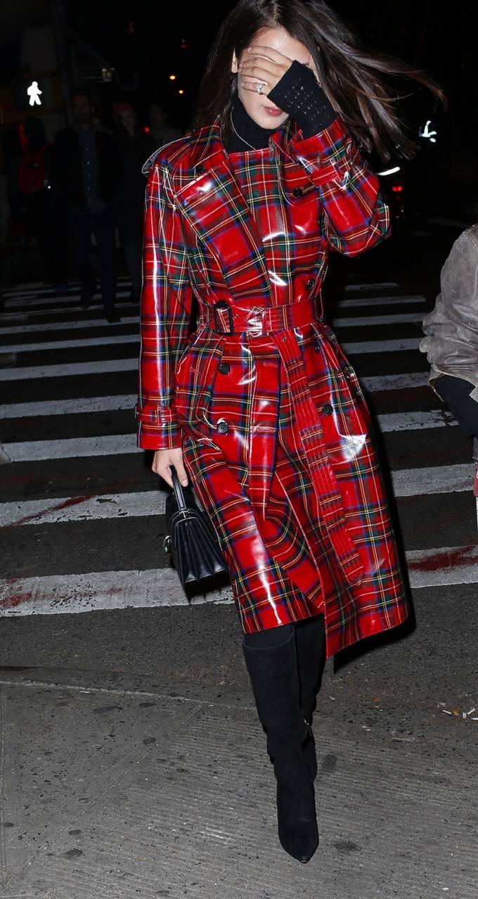 모델 벨라 하디드(Bella Hadid)는 같은 라미네이트 타탄 트렌치 코트지만 블랙으로 통일한 이너 룩에 강렬한 레드 색상으로 포인트를 준 스타일링을 선보였다.
