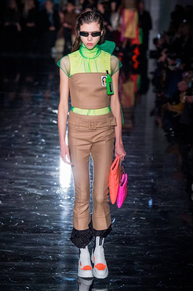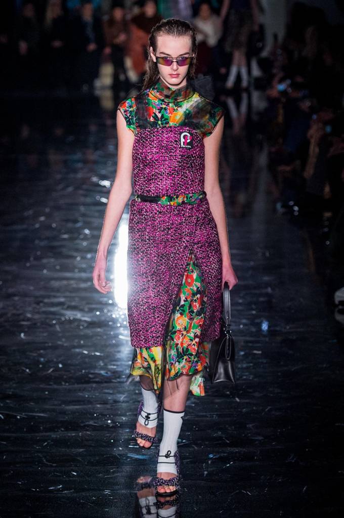 2018 가을/겨울 프라다 컬렉션은 인류 역사 발전에 빛이 되었던 산업혁명처럼, 네온-백라이트 무대와 실용적인 덧신 장화 등 우울한 시대의 희망을 암시하는 런웨이를 선보였다. 또 프라다를 유명하게 만든 나일론을 이번 컬렉션에 다시 귀환시켰다.