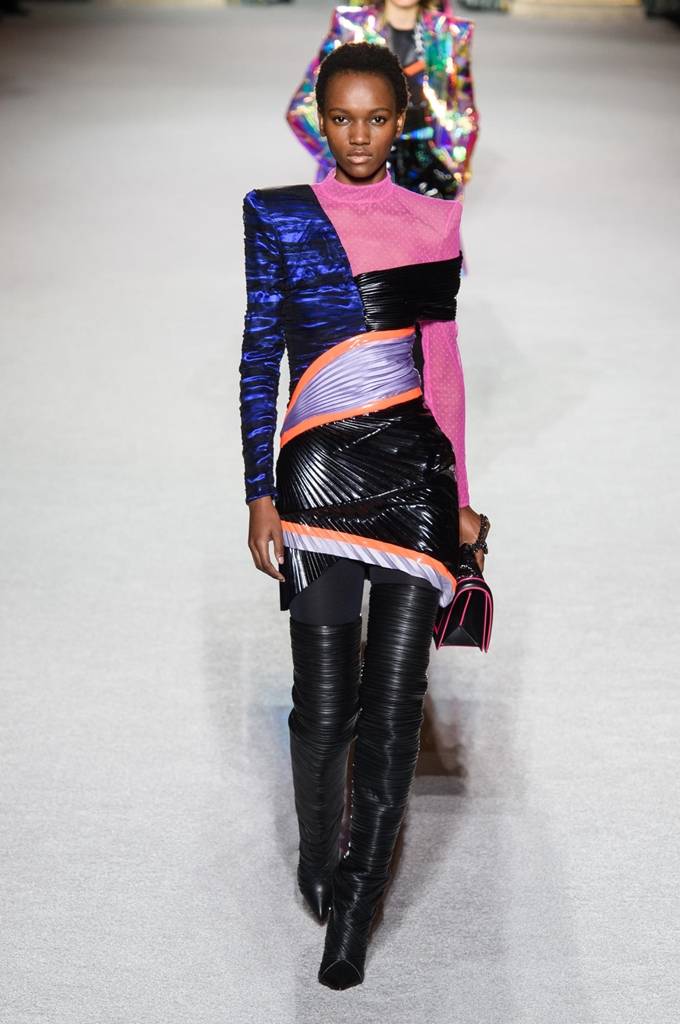 지난 3월 2일(현지 시간) 발망 아트 디렉터 올리비에 루스테잉은 2018 가을/겨울 발망 컬렉션을 통해 홀로그래픽 스팽글 장식, 야광 이브닝웨어, 투명한 비닐 사이-하이 부츠 등 반짝이는 소재의 화려한 글래머러스 룩으로 관객들을 미래 세계로 안내했다.