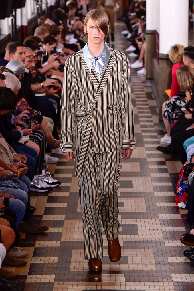 매력적인 앵클 부츠를 신은 남자 모델들은 트렌치와 우아한 컷 코트와 조화를 이루는 매칭 코트와 와이드 스트라이프의 컬러플한 셔츠에 이르기까지 형형색색 보석같은 주얼 톤으로 캣워크를 행진했다.