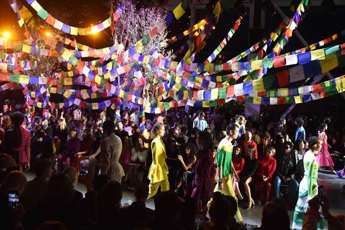 프라발 그룽은 네팔에서의 어린 시절에서 영감을 받았으며 그 지역의 장인들과 협력해 자수와 다른 수공예 터치를 작업했다. 컬러는 네온 브라이트였고 텍스추어, 믹싱 윈드브레이커 그리고 깃털이 달린 카고 팬츠의 스포티한 소재가 레이어드되었다.