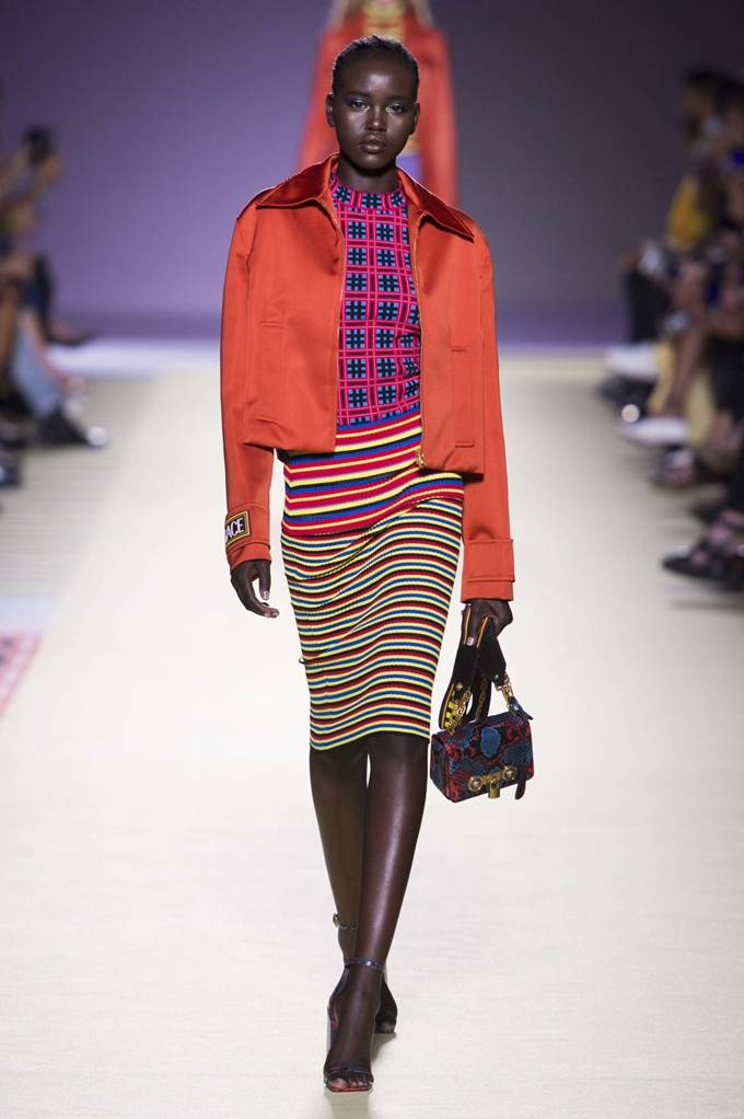몸에 딱 붙는 파티 드레스와 플랫폼 매치부터 화려한 레이보우 컬러의 시그너처 스카프-프린트 세퍼레이트에 이르기까지, 패션쇼에 초대 받은 관람객들은 '많은수록 좋다(more is more)'라는 하우스의 비공식 모토를 담은 베르사체 정신을 실제로 입고 있었다.