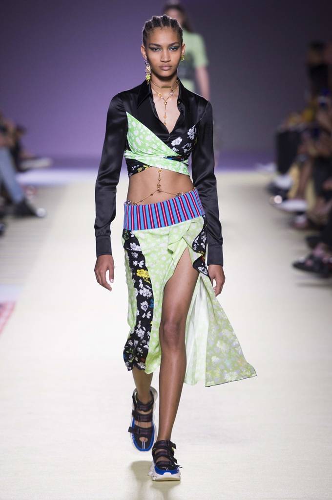 베르사체는 2019 봄/여름 컬렉션을 통해 충돌하는 프린트와 2000년대 초반의 클럽웨어를 선보였다. 특히 상업적인 측면에서 우아한 이브닝 드레스, 스니커즈 그리고 로고 티셔츠가 런웨이를 풍성하게 만들었다.