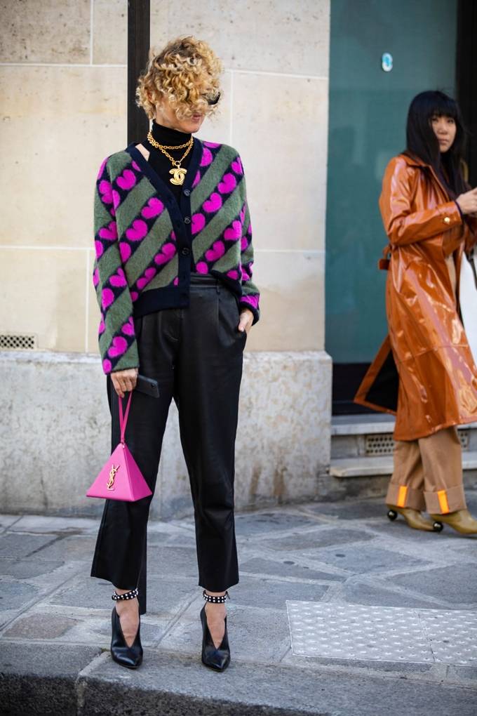 파리패션위크 마지막날 스트리트의 패피들은 화려한 애나멜 가죽 하이 웨이스트 트라우저, 오버사이즈 블레이저, 매트릭스에서 영감을 받은 트렌치, 퍼프 슬리브의 보머, 버튼-다운 맥시 드레스 등을 다수 선보였다.