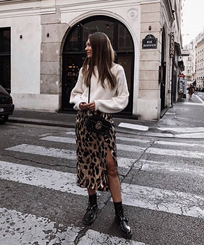 대담한 애니멀 프린트 미디 스커트는 다른 아이템과 매치를 하면 다양한 옷차림을 연출할 수 있다.