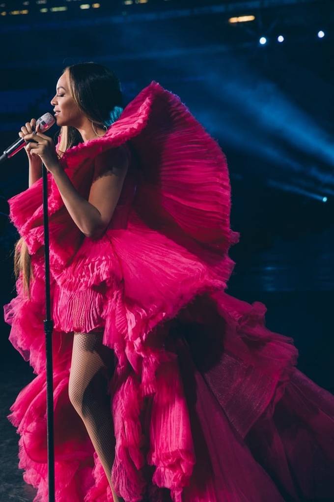 2. 영국의 팝 가수 에드 시런과 함께 듀엣으로 '퍼펙트'를 부를때 비욘세는 크리스탈처럼 빛나는 볼륨감 넘치는 핑크색 튤 가운을 입고 등장했다. 이 의상은 베이루트 디자이너 모하메드 애쉬가 전개하는 애쉬 스튜디오의 2018 봄/여름 꾸띄르 컬렉션에서 선보인 드레스다.