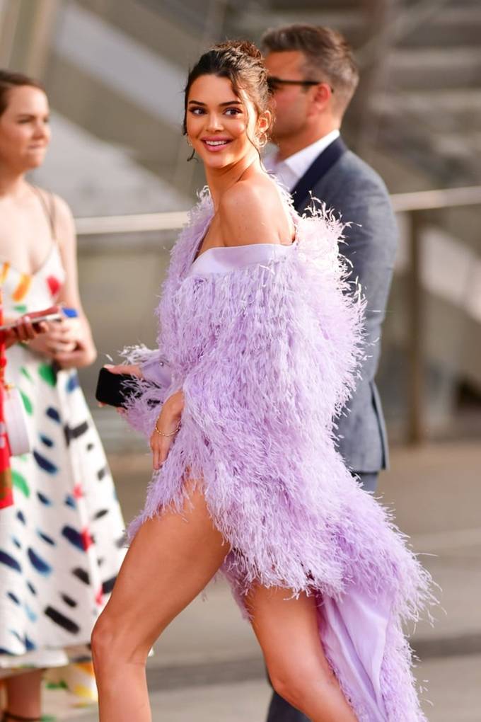 8. 켄달 제너는 2018 CFDA 어워즈에서 알렉산드레 보티에의 보풀이 나는 포근한 느낌의 퍼플 넘버 드레스를 착용했다. 허벅지까지 올라간 과감한 슬릿은 늘씬한 다리가 길어 보이는 효과를 연출했다.