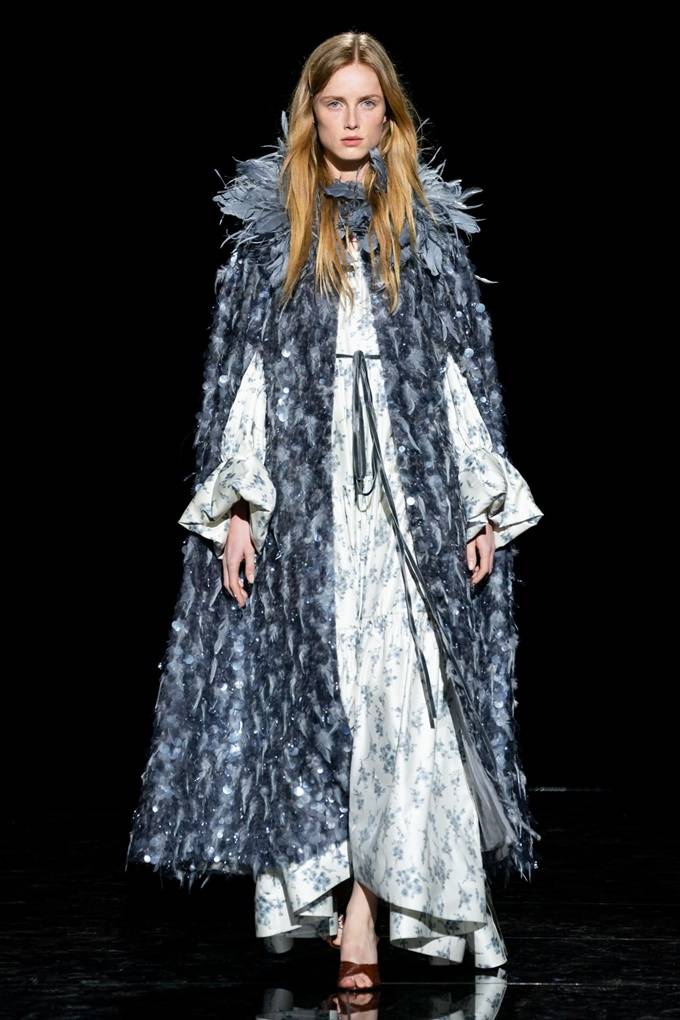 극단적인 오버사이즈 드레스도 있었다. 마리골드, 라일락, 스카이 블루, 양귀비 레드와 바다 거품, 풍부한 컬러와 패턴의 케이프 코트, 모피 스테이트먼트 아우터웨어, 그리고 장식용 금속조각인 파이에트, 반짝이는 타이츠, 풍성한 깃털 등이 돋보였다.