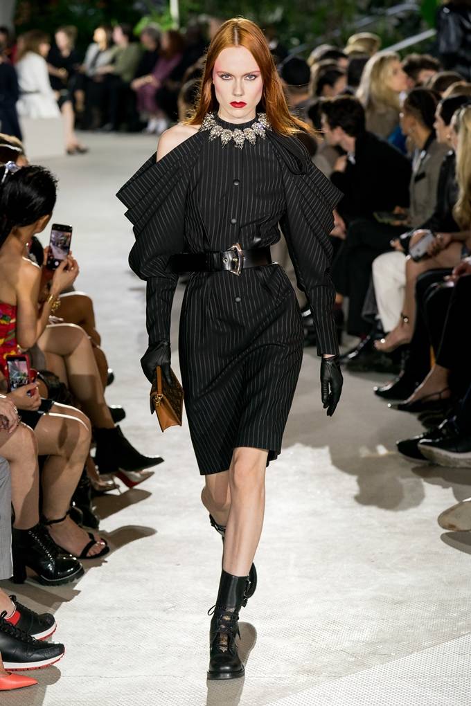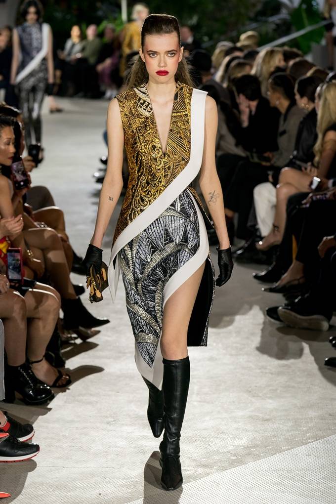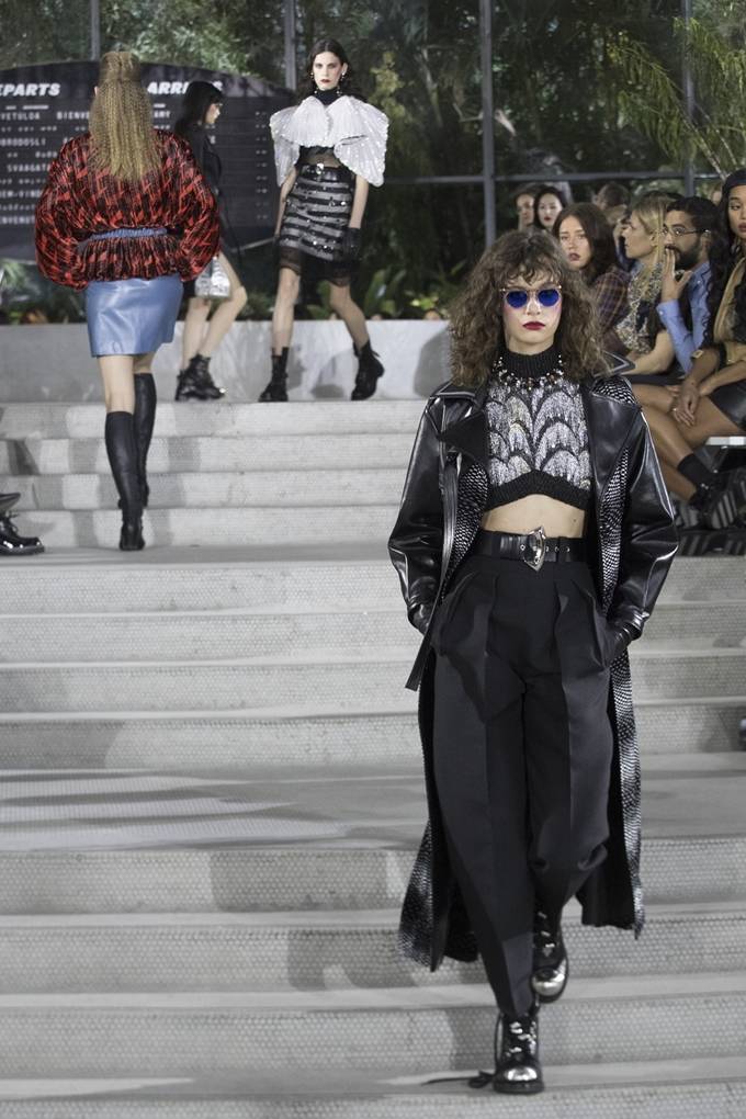 걸크러시에게 적합한 올 블랙의 에나멜 가죽 아이템, 기하학적인 케이프, 스팽글 장식과 대담한 스트라이프 등도 돋보였다. 강력한 룩들은 골드-토 컴뱃 부츠, 샤프한 선글라스, 젯-블랙 캡으로 마무리되었다.