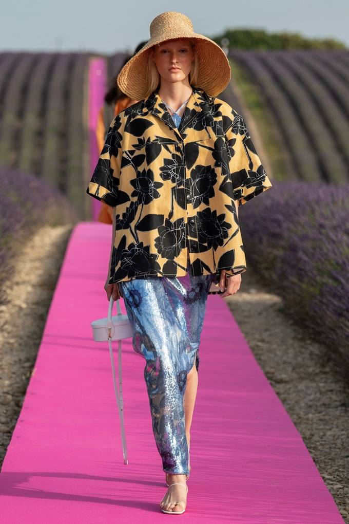 먼저 영국 화가 데이비드 호크니 특유의 컬러와 팔레트가 눈길을 끌었다. 푸크시아와 오렌지의 밝은 팝 컬러부터 스위트한 중성톤의 파스텔 핑크와 민트, 라이트 블루에 이르기까지 다양했다. 대부분의 룩들은 라벤더 밭의 몽환적인 장면에 추가된 톤다운 스타일링과 컬러 블로킹을 강조했다.