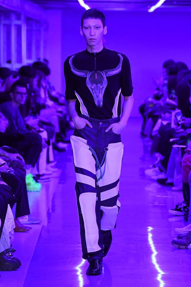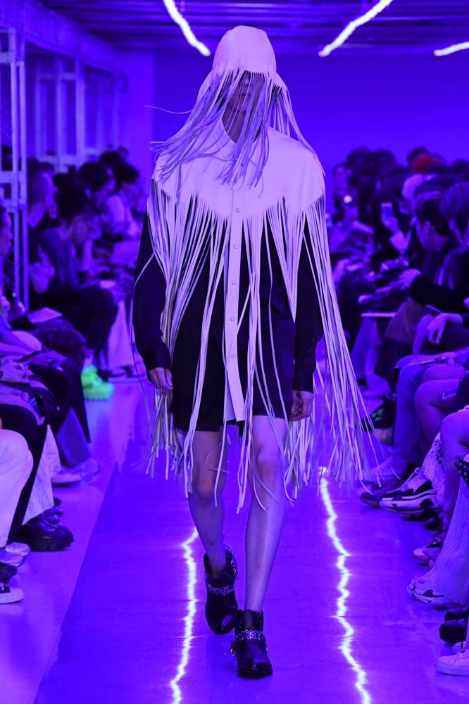 이어 트렌치 코트를 입은 모델의 네온 컬러 팬츠, 네크리스 백 체인의 네온 장식, 타이다이 티셔츠의 은은한 네온 컬러는 퓨처리즘을 연상시키는 듯했다. 네온 컬러로 머리를 염색한 모델 역시 전반적인 쇼에서 포인트를 더했다.