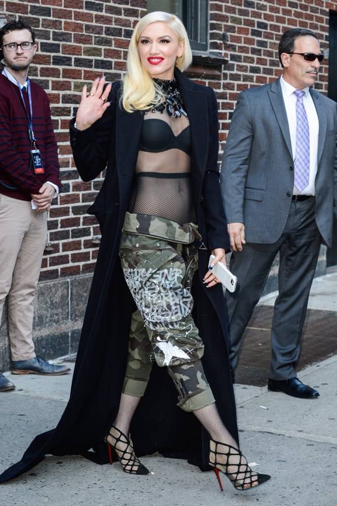 8. 그웬 스테파니는 피시넷 타이츠와 란제리를 입고 롤오버 카고 팬츠를 매치해 '노아웃' 그룹 활동 시절을 떠올리게 했다.