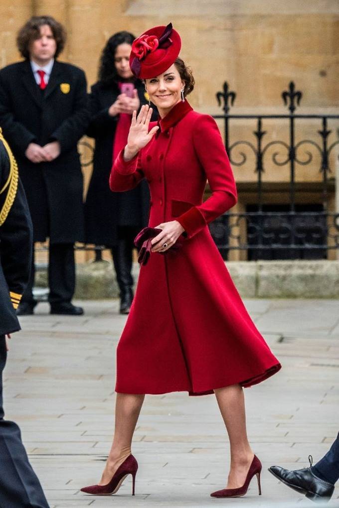 3. 케이트 미들턴은 지난 2020년 3월 9일 연연방의 날 기념식에 예배에 디자이너 캐서린 워커의 레드 코트와 깔맞춤한 패시네이터를 착용했다. 이 레드 코트는 지난 2018년 샌드링엄에서 열린 성탄절 예배에서 착용했다.