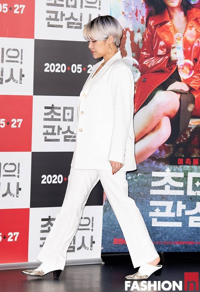 이날 언론 시사회에는 머리부터 발끝까지 걸크러시 올 화이트룩으로 카리스마를 발산했다.