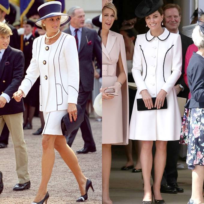 5. 1995년 재향군인 대일본 전승기념일 퍼레이드에서 다이애나 비는 화이트 스커트 슈트룰 선보였다. 케이트 미들턴은 2019년 6월 가터 훈장 수여식에서 시어머니의 스커트 슈트의 코트 드레스 버전을 선보였다. 모자는 패시네이터로 바꾸었다.