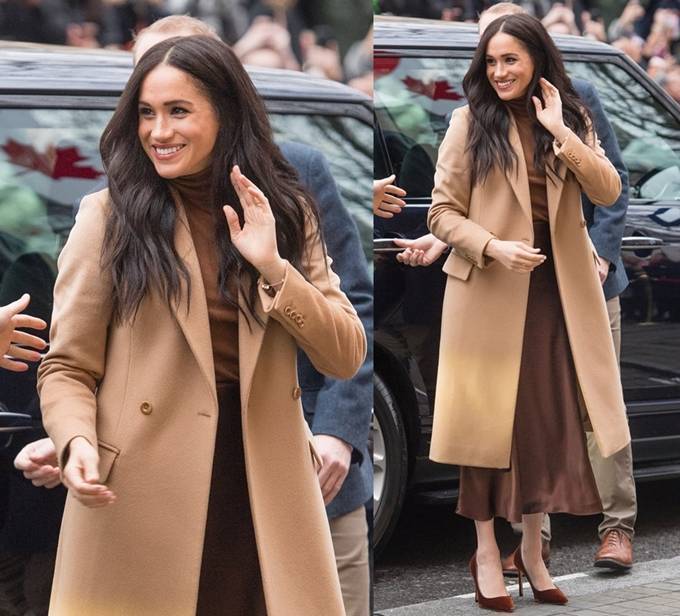 메건 마클은 지난 1월 왕실 독립선언 전날 마지막 공식석상에서 카멜 코트룩을 선보였다.