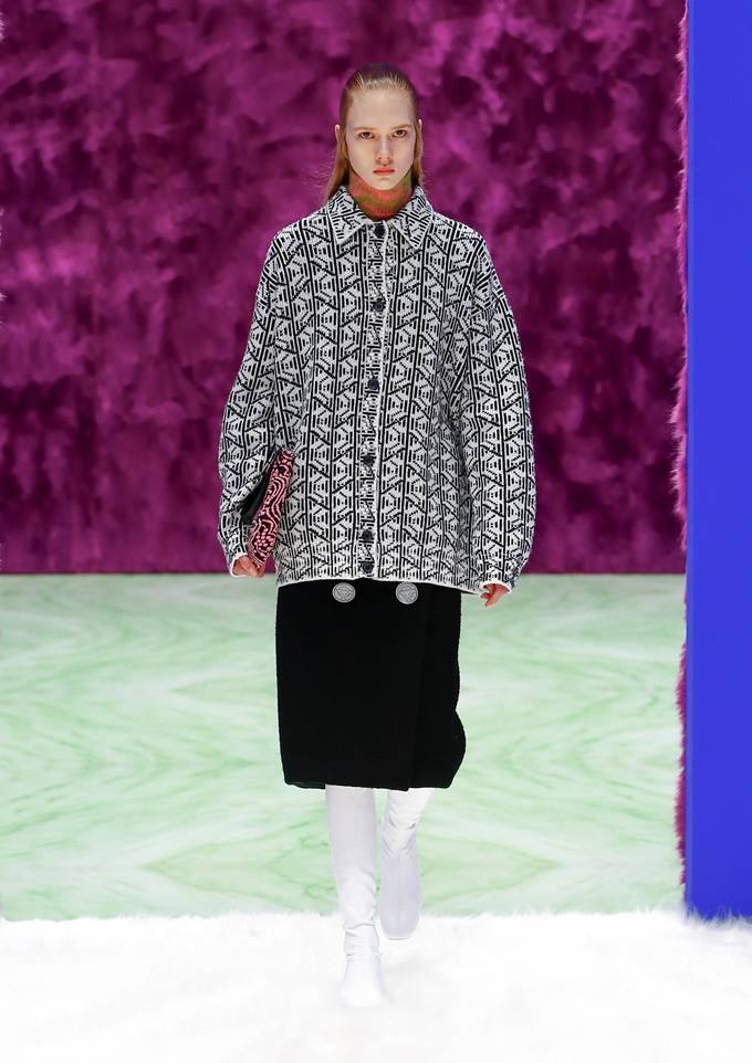 스팽글과 인조 모피는 프라다의 시그니처인 나일론 직물과 조화를 이루었으며 프린트 자카드 니트는 레깅스, 터틀넥, 레깅스 슈트, 가방으로 재작업했다.