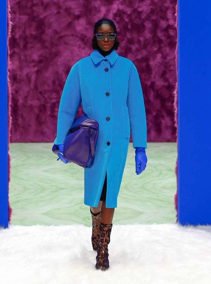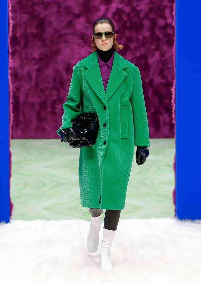 한편 프라다의 2021 가을/겨울 컬렉션은 코툰 스타일의 오버핏 코트와 기하학적 패턴의 포근한 인조 모피 코트룩, 그래픽 스팽글 드레스, 클래식한 슈트룩 다양한 프린트의 레깅스 슈트룩이 주목을 끌었다.