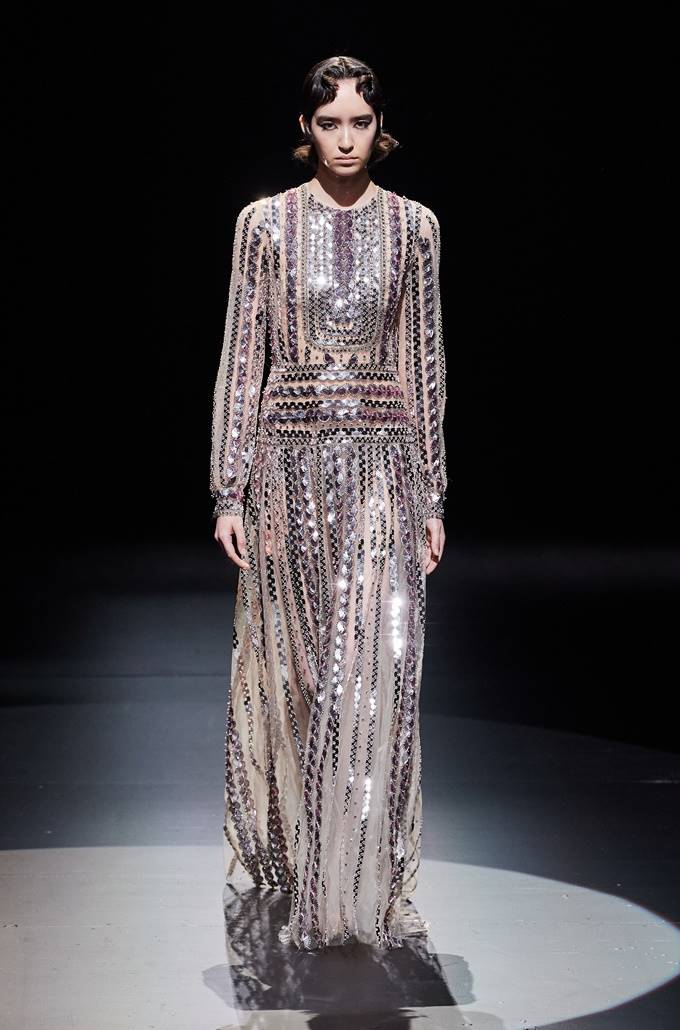 마지막으로 섬세한 자수, 크로셰 뜨개질 및 니트 디테일과 테일러링이 있는 쉬폰 드레스는 발렌티노의 시그니처 장인 정신을 보여주었다.