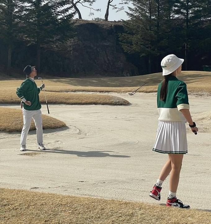 공개된 사진 속 손담비와 이규혁은 그린 골프 커플룩으로 라운딩을 즐기는 모습과 함께 공이 벙커에 빠져 머쓱한 표정과 포즈로 카메라를 응시해 웃음을 자아냈다.