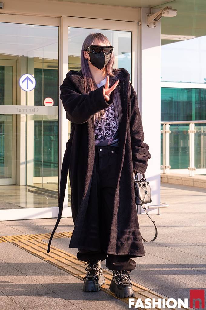 이날 씨엘은 블랙 선글라스와 마스크로 얼굴을 가리고, 힙한 블랙 와이드 팬츠에 오퍼핏 블랙 롱 코트로 걸친 힙하면서도 신비스러운 공항룩을 완성했다. 또 여기에 투박한 슈즈를 착용해 힙한 스타일을 더욱 돋보이게 했다.
