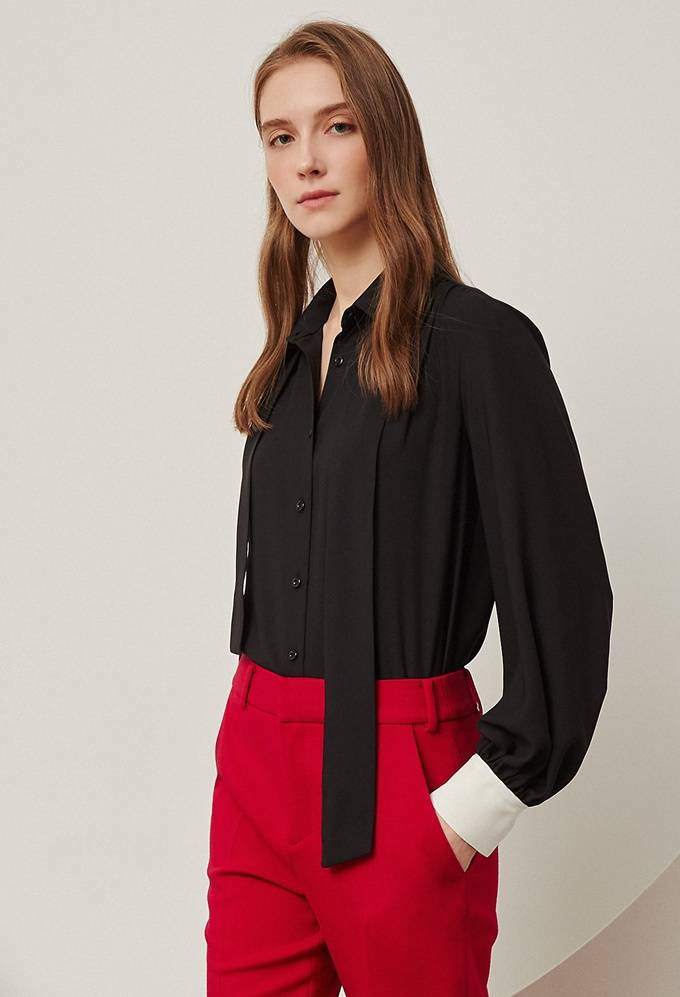 매끄럽게 흐르는 실키한 텍스처에 부분 셔링으로 포인트를 더해준 여성스러운 분위기의 블라우스로 함께 구성된 리본으로 다양한 연출이 가능하다.
