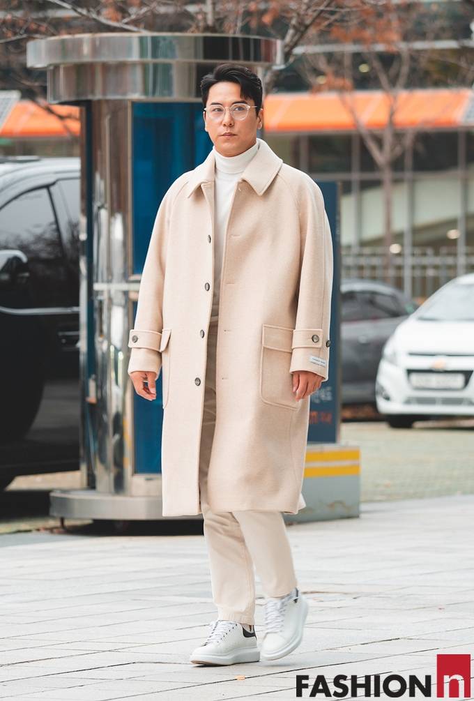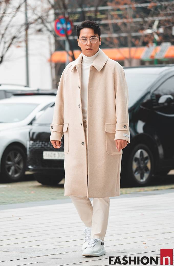 이날 장민호는 듬직한 맏형 포스에 화이트 팬츠와 화이트 터틀넥에 베이지 코트를 걸친 캐주얼하면서도 댄디한 패션 스타일을 완성했다.