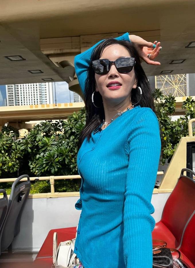 공개한 사진에서 장영란은 화려한 페이즐리 스커트에 하늘색 니트 카디건을 걸친 캐주얼하면서도 스타일리시한 여행룩으로 눈길을 끌었다.
