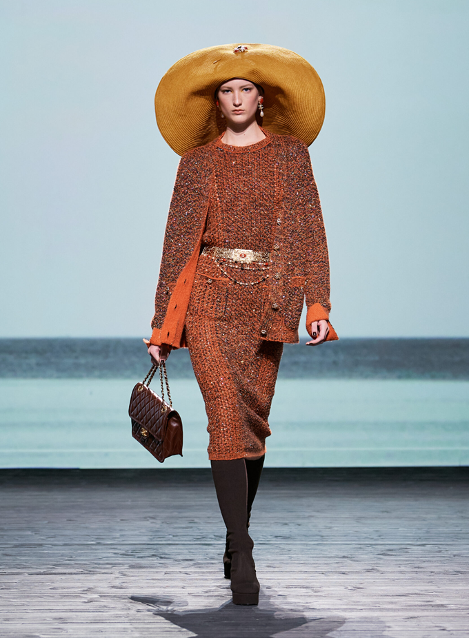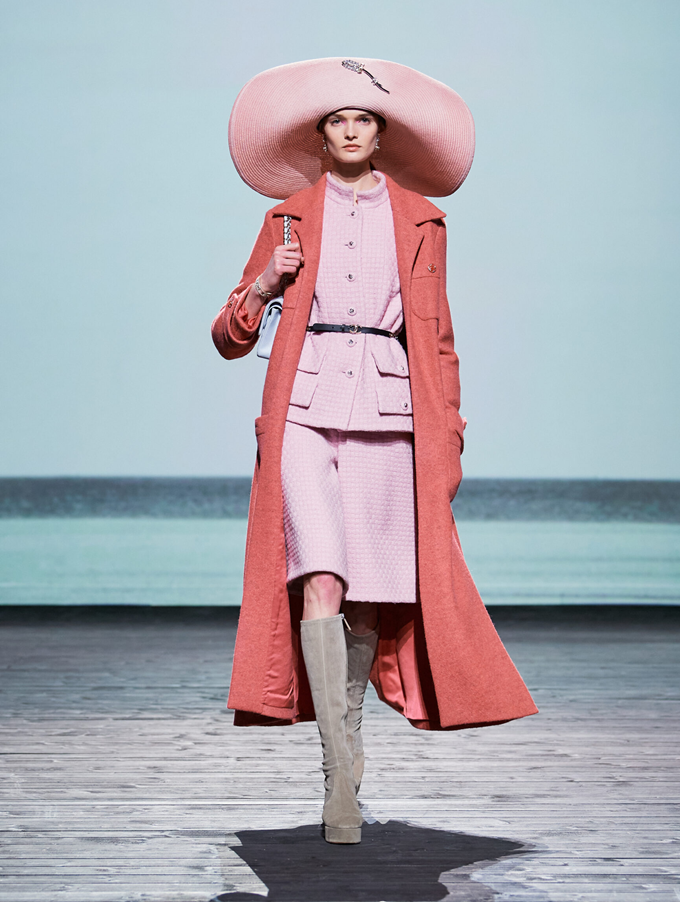 챙이 넓은 밀집 모자, 프린트된 실크 스카프, 데이비드 보위를 연상시키는 무릎 높이의 플랫폼 부츠는 가브리엘 샤넬의 개인 스타일을 남성적이면서도 우아한 낭만적인 휴양지룩으로 재현했다.