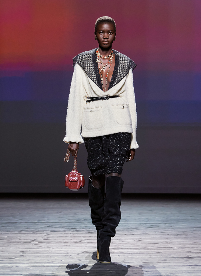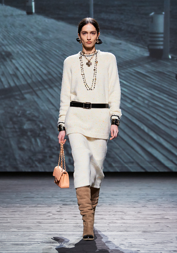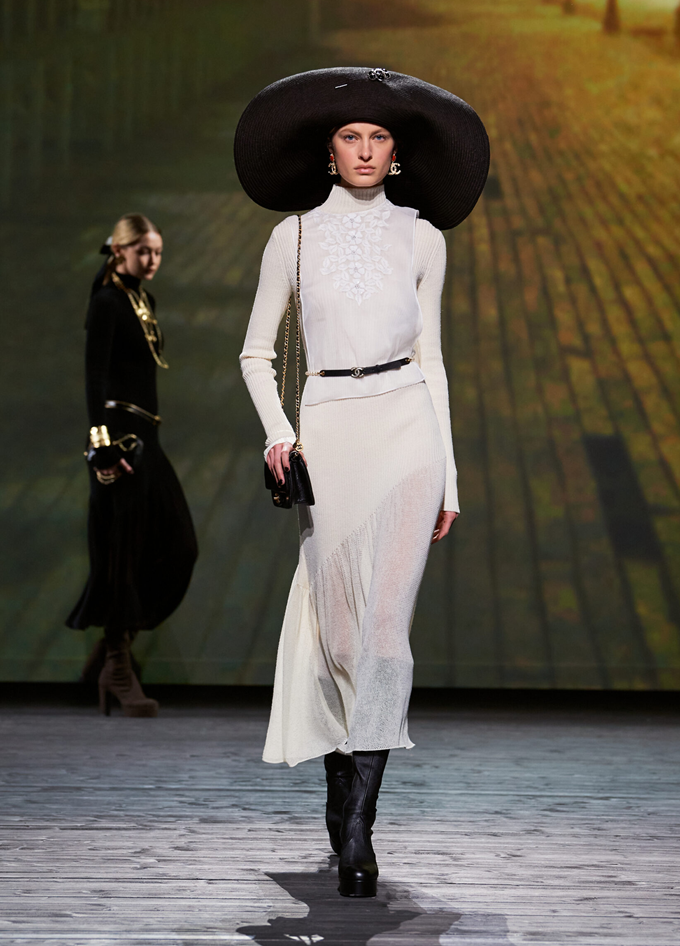 샤넬 패션쇼는 브래드 피트(Brad Pitt)와 페넬로페 크루즈(Penélope Cruz)가 주연을 맡은 노르망디 해변 마을 배경의 흑백 영화 '남자와 여자(Un homme et une femme)'의 거대한 LED 스크린을 배경으로 시작했다.