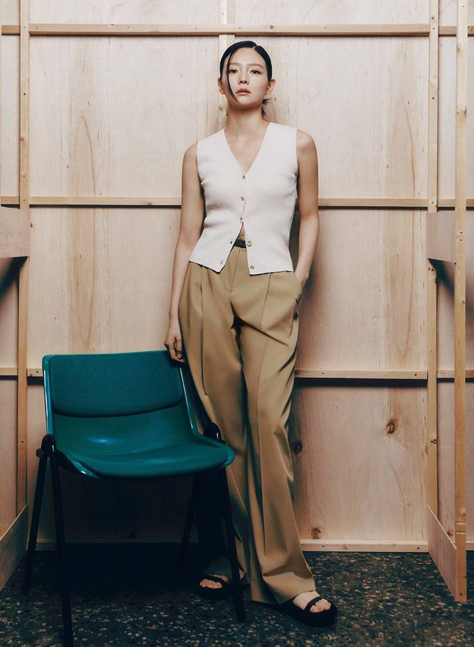 이솜이 착용한 '쉬즈미스' 니트 베스트는 린넨 소재로 통기성을 높였으며 베이지, 브라운 2가지 컬러로 출시되었다.
