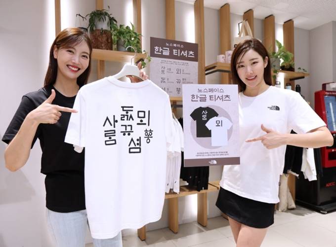 우리가 매일 말하고, 듣고, 쓰고, 보는 한글에 대한 관심과 애정을 높이고자 이번에 선보여진 노스페이스 한글 티셔츠는 사람, 산, 닭, 왕자, 섬 및 (넓을) 홍의 6개 글자와 관련해 현재는 사용되지 않는 옛 한글 타이포그래피가 적용됐다.