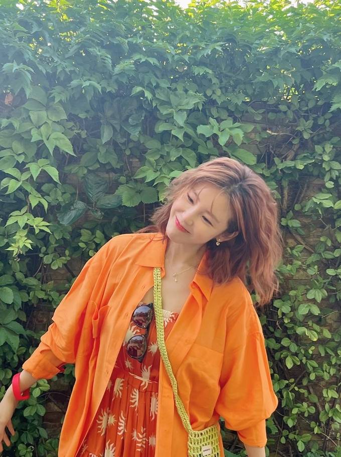 공개한 사진에서 전효성은 오렌지 색상의 원피스에 같은 톤의 오버핏 셔츠를 걸친 톤온톤 오렌지룩으로 캐주얼하면서도 여성스러운 호캉스룩을 완성했다.