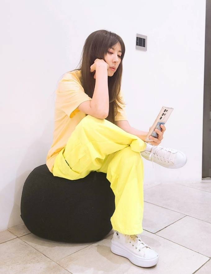 공개한 사진에서 김완선은 길게 늘어뜨린 헤어 스타일에 옐로 팬츠와 티셔츠를 착용한 톤온톤 스타일의 데일리룩으로 힙하면서도 발랄한 모습을 선보였다.
