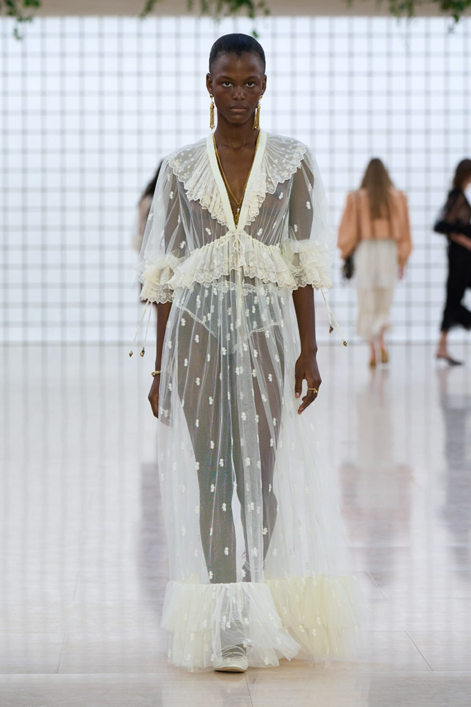 레이스와 시폰 블라우스, 드레스, 망토, 스커트 등은 유려한 실루엣과 물결치는 형태의 자연스러운 레이스 장식이 어우러지며 자유롭고 역동적인 에너지가 넘쳤다.