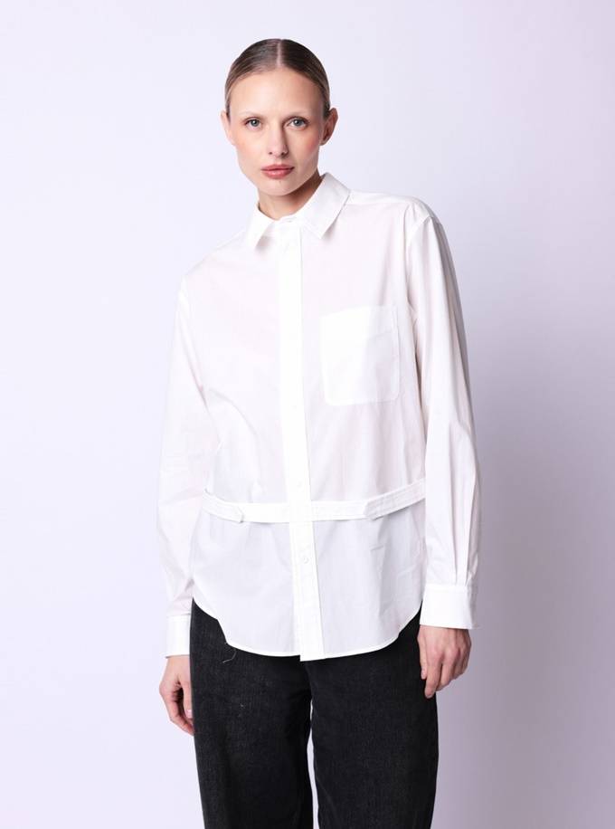 프렌치 컨템포러리 브랜드 '베르니스' 벨트 포인트 화이트 셔츠 및 플레어 미디 스커트 '관심폭발'