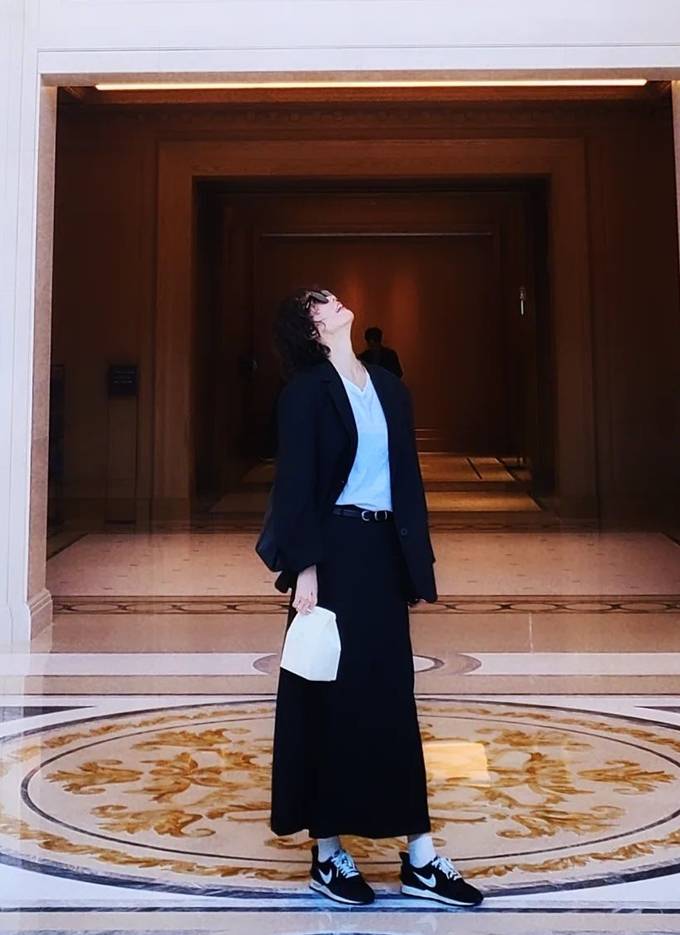 공개한 사진에서 송경아는 짧은 펌 헤어 스타일에 블랙 롱 스커트와 화이트 티셔츠에 블랙 재킷을 걸친 슈트룩으로 시크하면서도 스타일리시한 나들이 스타일을 완성했다.