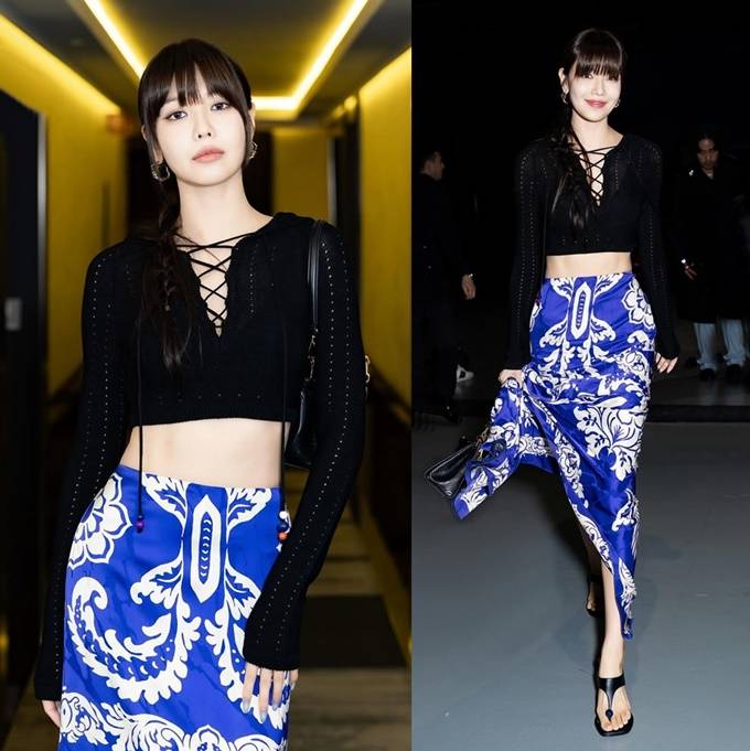이날 수영은 상큼한 페이즐리 문양의 랩스커트와 블랙 후드 크롭 니트를 매치한 휴양지 분위기의 매혹적인 패션위크 스타일로 등장과 동시에 시선을 강탈했다.