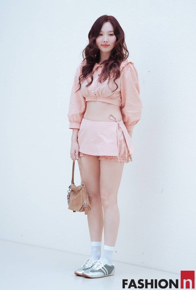 나연은 이날 허리 라인 러플 디테일과 세일러 칼라의 크롭 핑크 블라우스와 셔링 쇼츠 셋업의 화사한 쇼츠 투피스룩으로 시선을 강탈했다.