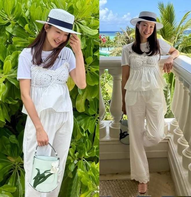 공개된 사진 속 이시영은 화이트 티셔츠와 팬츠, 여기에 크로셰 니트와 밀집모자를 레이어드한 올 화이트 여행룩으로 시선을 사로잡았다.